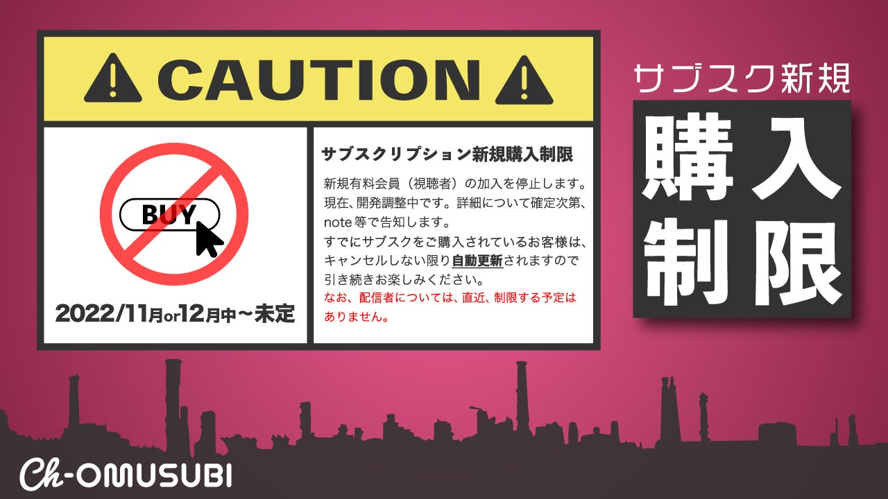 おむすびチャンネルに入会し、コンテンツを利用するためには、サブスクリプションを購入=「有料会員になる必要」があります。今般、有料会員の急増を受け、コミュニティの規律維持と品位の向上、既存会員様の満足度向上のために、新規有料会員の加入を原則停止いたします。なお、加入停止期間は、現時点で未定であり、長期的、もしくは、恒久的に制限をかける可能性がございます。更なる詳細は、近日中にお知らせいたします。