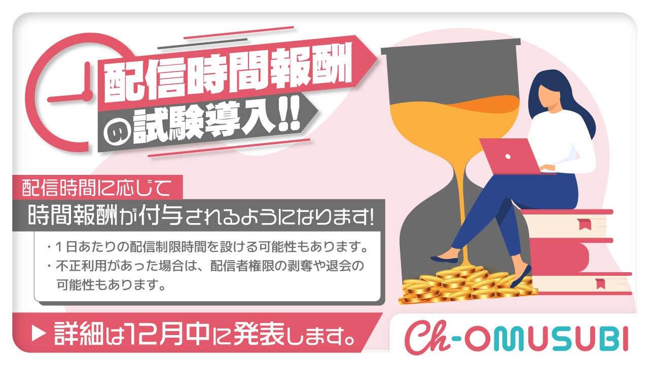 おむすびチャンネルでは、会員が「配信者」と「視聴者」に分かれており、配信者はライブ配信における視聴者からの投げ銭機能のほか、定額継続支援機能「おむすびサポーター」等を通じ、収益を得ることができます。今後は、配信者が配信をする時間に応じて報酬を付与する「配信時間報酬」など、収益ポイントを拡大して参ります。導入は、12月下旬を予定しており、更なる詳細は近日中にお知らせいたします。