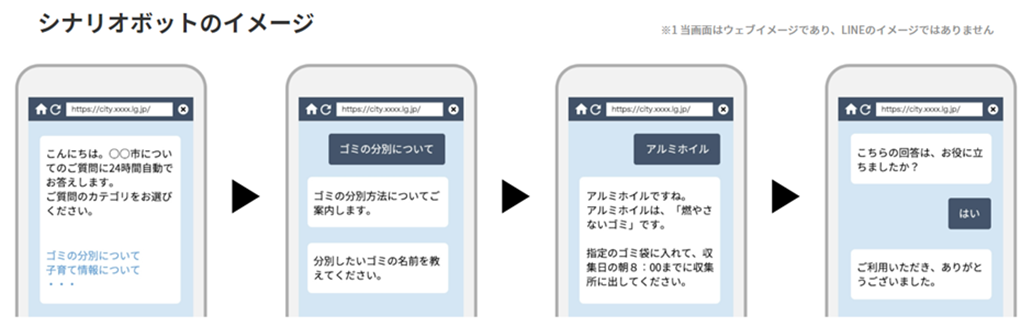チャットボット「MOBI BOT」で、よくある問い合わせ・質問はAIやチャットボットで自動回答することが可能です。よくある質問は自動対応することで、住民は24時間問い合わせができ、職員の負担の軽減に貢献します。「MOBI BOT」を利用したFAQ自動回答サービスでは、シナリオ型ボットとAIを使った1問1答形式のボット(AI型)の両方の構築が実現できます。