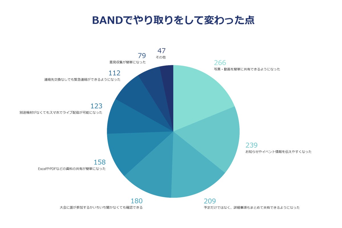グループ活動の際、難しい部分をBANDでやり取りをして変わった点はは?という質問に、「スケジュール共有から詳細のお知らせ」「参加する人の出欠確認がきるようになった」という回答を合わせて77%でした。皆さんの悩みである出欠確認とお知らせの難しさが、オンラインでやり取りをすることで、効率よくなり、情報共有と運営がよりしやすくなったということが伺えます。