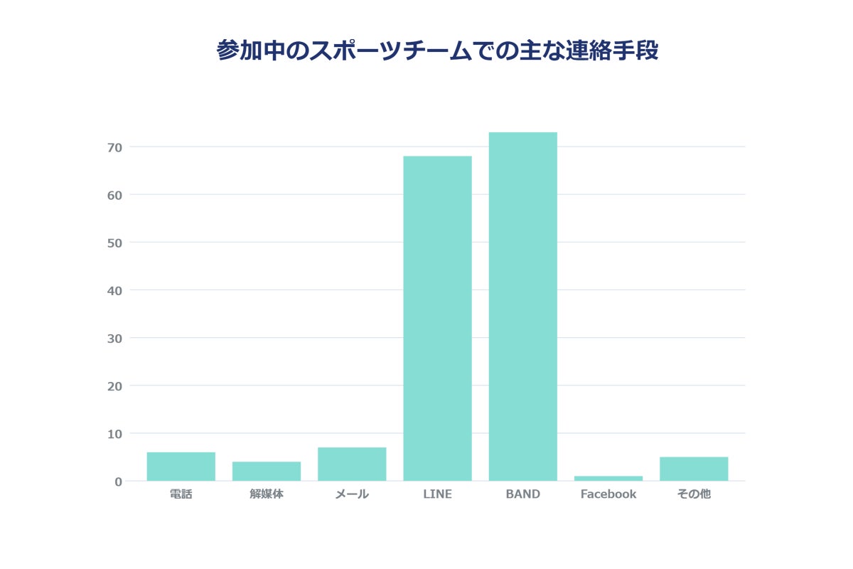 現在参加しているスポーツチームで主な連絡手段は?という質問に、「メール」7%、「電話」6%と一番低く、オンラインラ連絡ツールを利用している方が平均77%で最も多く、オンラインでやり取りをしていることが分かりました。その中、利用ツールとしては「BAND」73%、次が「LINE」68%という、結果となり、近年は多くのスポーツチームでは、かなりオンライン化が浸透していることが分かりました。