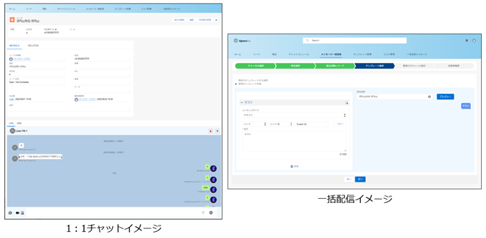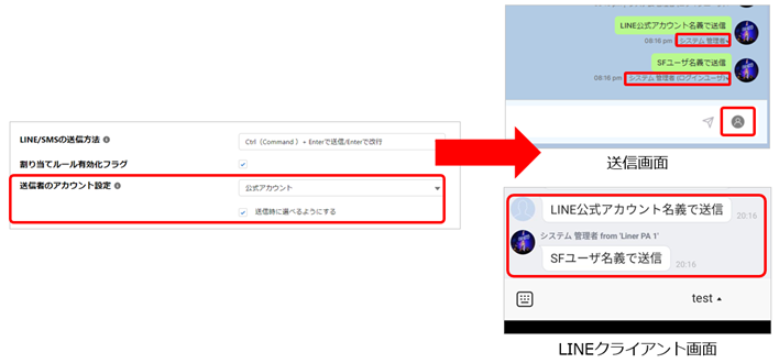 Salesforce上から1:1のチャットでメッセージを送る際に、これまでLINE公式アカウントの表示名でメッセージを送信していましたが、「送信者のアカウント設定」で機能を有効化することで、送信時に現在のSalesforceのログインユーザーの表示名または別途設定した任意の表示名で送信することが可能になります。LINE公式アカウント(企業としての顔)としてだけでなく個人の顔が見える対応が可能となることで、エンドユーザーは企業側の担当者をより身近に感じることができ、顧客満足度やロイヤルティの向上に繋がる可能性があります。