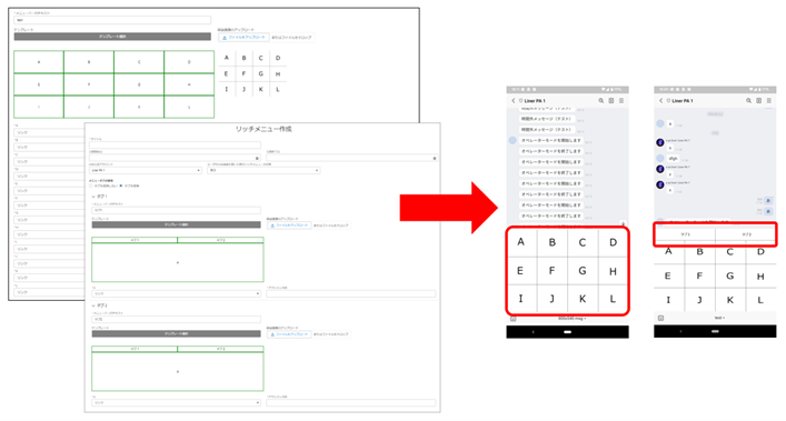 最大で12個のアクションに対応し、更に2つのメニューをタブで切り替えることができるようになりました。より柔軟で自由度が向上したリッチメニューの作成及び運用が可能になります。