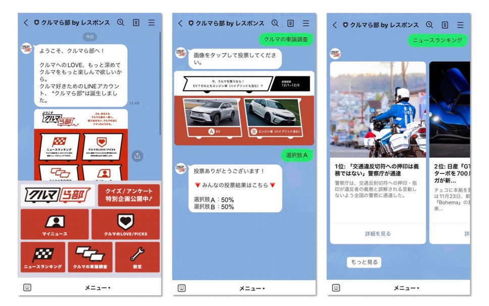 『クルマら部』では、レスポンスの人気コンテンツが読める「ニュースランキング」だけでなく、様々なジャンルの第一人者の視点からLOVEなニュースを紹介する「クルマのLOVE! PICKS」のほか、参加型のアンケートやクイズも展開。読者一体型コンテンツを提供します。