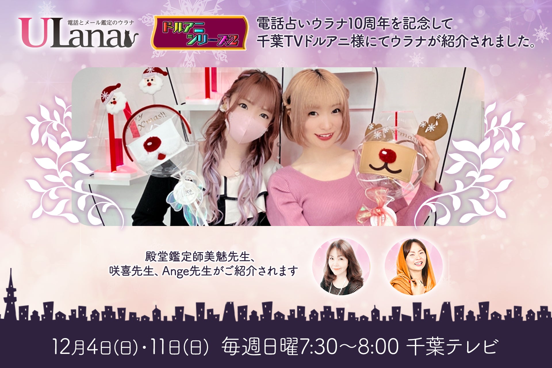 ◆株式会社エムティーアイが運営する『電話占いウラナ』は、2022年12月12日にてサービスを開始してから10年目となり、千葉TV「ドルアニ」にてウラナ10周年特集番組が2022年12月4日(日曜日)朝7:30~8:00、2022年12月11日朝7:30~8:00の2回に分けて放映されます。