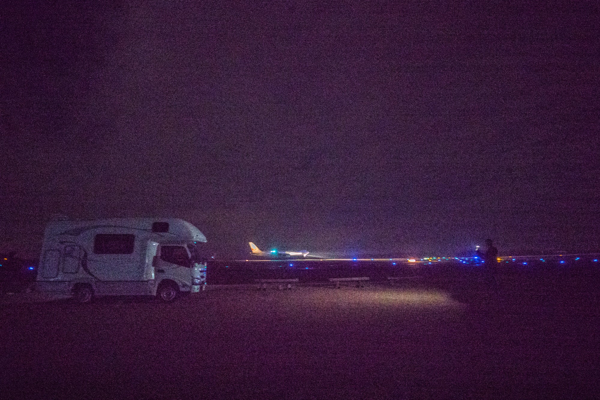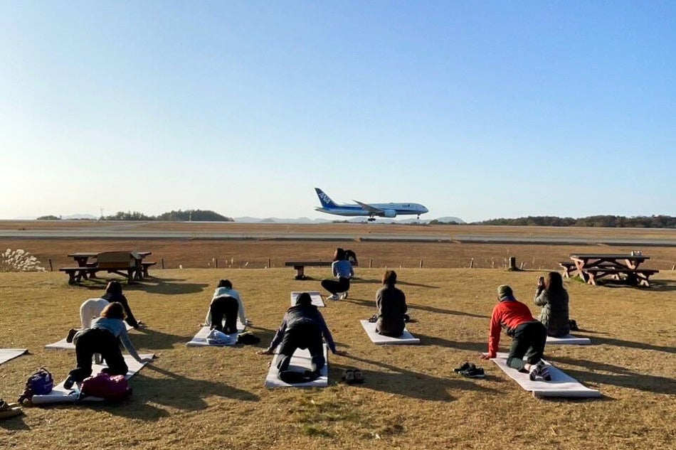 【朝方、ヨガを楽しむ参加者や、夜間の飛行機が離発着する様子を見学する参加者】