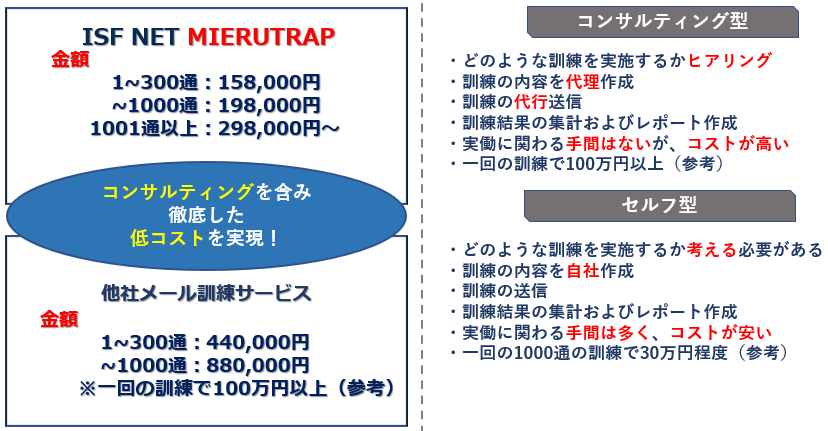 100種類以上のフォーマットからフルカスタマイズが可能となっており、コンサルタントからの訓練フォローも含んでおります。1~300通:158,000円、~1000通:198,000円、1001通以上:298,000円~と、従来のメール訓練サービスに比べて内容の充実を図るとともに低価格を実現したサービスとなっております。