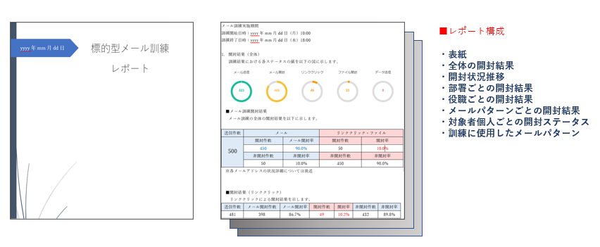 標的型攻撃メールを模擬した訓練メールをユーザに送信し、攻撃メールへの対応確認と教育に向けた訓練サービスです。最新のメール攻撃パターンを搭載し、URLリンク及び添付ファイルを開封した対象者には訓練用のコンテンツが表示されることで、従業員への注意喚起とセキュリティ教育の効果があります。