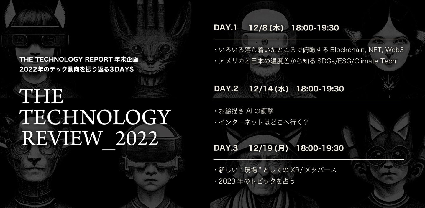 Dentsu Lab Tokyo(東京都港区)とBASSDRUM(東京都港区)が出版する『THE TECHNOLOGY REPORT(ザ テクノロジー レポート)』は、年末企画として2022年のテック動向を振り返る「THE TECHNOLOGY REVIEW_2022」を開催します。様々なテクノロジーが話題になった2022年の全体のトレンドについて振り返りながら、2023年に大きな変化を生み出す可能性を感じるテクノロジーについて、多彩なゲストをお招きしてディスカッションする3日間となります。