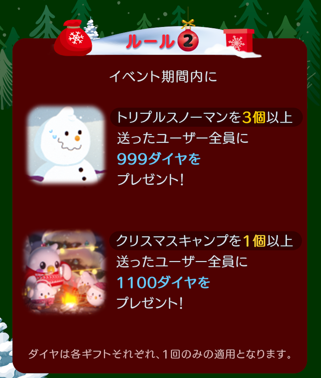 ・クリスマスキャンプを1個以上送ったユーザー全員に1100ダイヤをプレゼント!