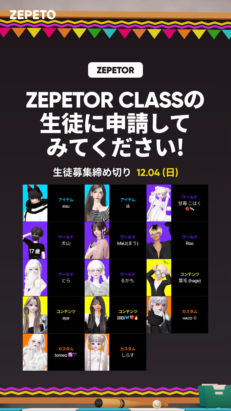 メタバースでのクリエイション活動に興味をもつ人を対象に、ZEPETOで活躍するための知識と制作技術を学べる「ZEPETOR CLASS(ゼペッター クラス)」を開催します。日本では4回目の実施となり、「アイテム」「ワールド」「コンテンツ」「カスタム」のコースを展開します。