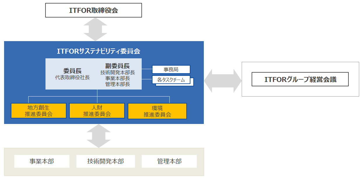 新体制では、代表取締役社長が委員長を務めるアイティフォーサステナビリティ委員会の下に、「地方創生推進委員会」「人財推進委員会」「環境推進委員会」の3つのマテリアリティに対する推進委員会を設置しました。各推進委員会は3名の取締役が委員長となり、課題解決に向けて取り組みを推進していきます。