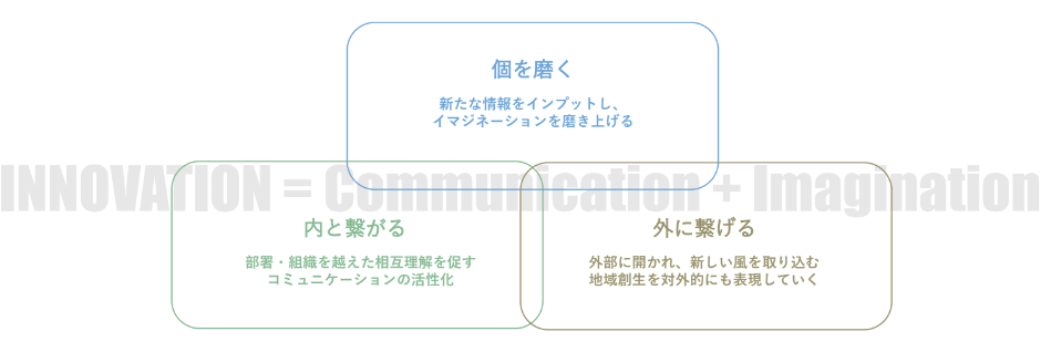 「INNOVATION=Communication+Imagination」。新たな発想を生み出すためには、コミュニケーションと想像力が必要です。そのためには、組織は関係なく自由に空間と時間が共有できる場づくりとして、従来の考えや価値観にとらわれない新たなオフィス環境づくりが不可欠でした。そこで当社は、従来の2フロアに加え新たに1フロアを増床。3つのフロアのリニューアルコンセプトとして、「個を磨く」「内と繋がる」「外に繋げる」の3つのキーワードを掲げ、サステナブルなワークプレイスづくりを目指しました。