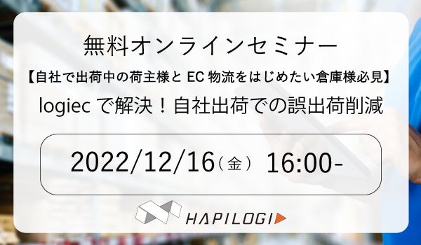 流通インフラプラットフォームサービスを展開する株式会社はぴロジ(所在地:東京都港区虎ノ門、代表取締役社長:木村 和弘、URL:https://www.hapilogi.co.jp、以下「はぴロジ」)は、2022年12月16日(金)16:00〜に『logiecで解決!自社出荷での誤出荷削減』と題した無料オンラインセミナーを開催いたします。