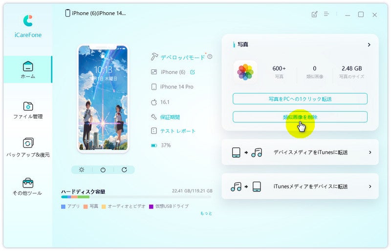 まず、iCareFoneを利用してiPhoneの重複・類似写真を一括削除する方法を紹介します。誰でも簡単に数ステップでたくさんの重複・類似写真の抽出が可能な高機能さが揃っているiCareFoneは、最高画質の写真も自動で保存してくれますので、これによりiPhoneのメモリが大幅に削減されますでしょう。