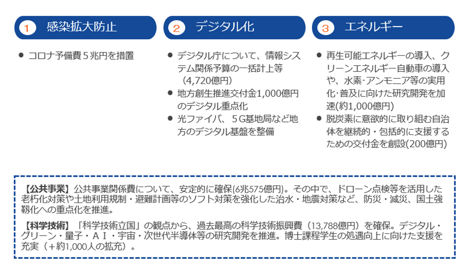 本年度の国家予算は、令和3年度補正予算と⼀体として、新型コロナ対策に万全を期しつつ、「成⻑と分配の好循環」による「新しい資本主義」の実現を図るための予算、という特徴が大きくみられます。