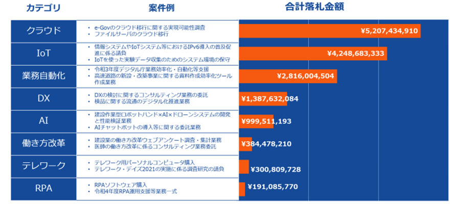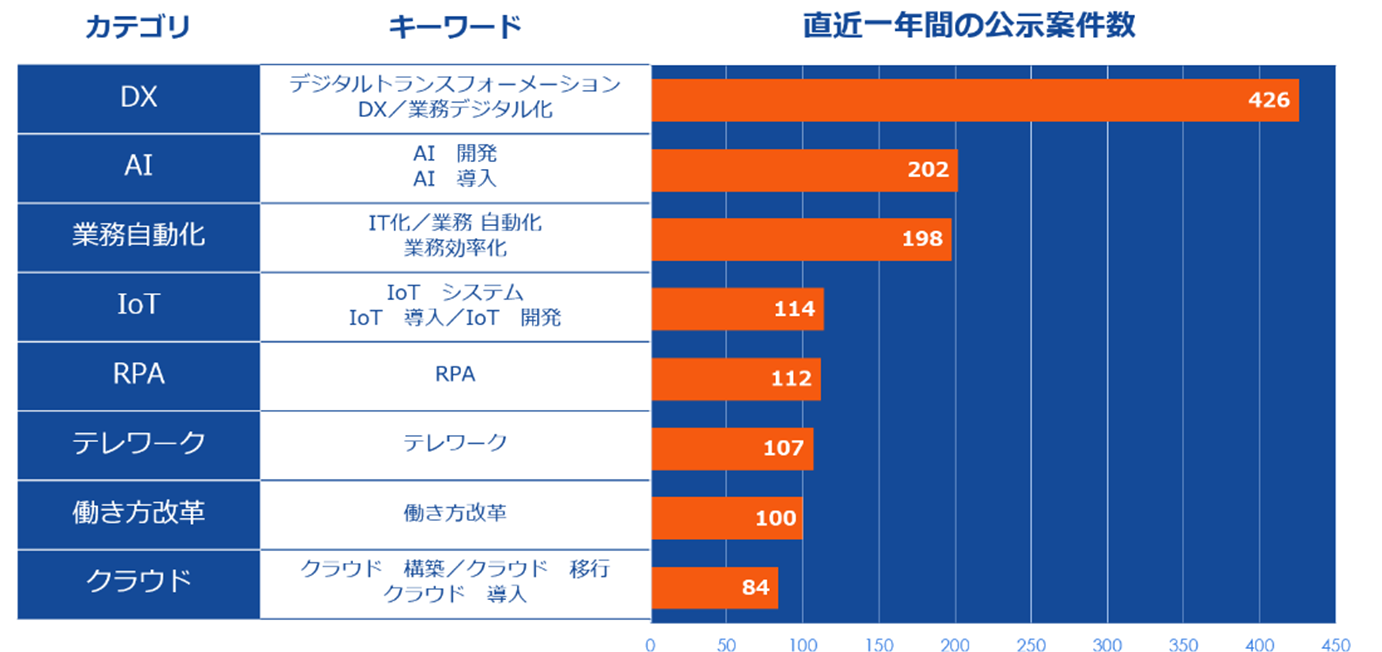 昨今、注目の集まる「DX」関連が公示案件数1位に浮上。一方、落札金額では、「クラウド」や「IoT」、「業務自動化」などシステム系の案件が上位に。