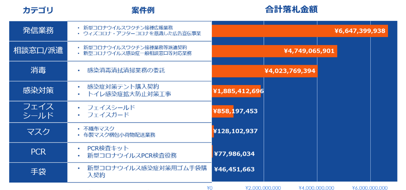 公示案件数は「手袋」が1,817件と1位に。落札金額では、広報業務や広告などの宣伝事業が1位、次いで窓口や派遣業務、消毒作業などの人材案件が2位、3位と続いた。