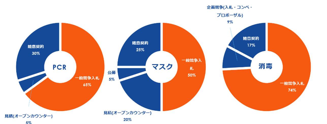 それぞれの入札方法ですが、「①感染拡大防止」は、緊急性の高い案件が多いものの、価格勝負の一般競争案件も多く公示されています。この特徴は、「②デジタル化」も同様です。他方で、「③エネルギー」は、他の2つと比較し随意契約が多いことがわかります。これは専門的な知識や技術が必要になることが多い分野のため、価格競争ではなく一定の必要要件を満たす事業者に委託される傾向があるためです。