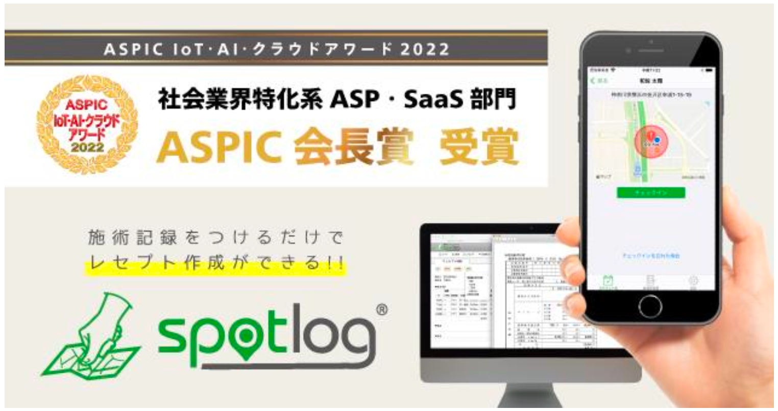 株式会社YTC・PLUSが提供する、訪問マッサージのレセプトソフト「spotlog」が、 ASPIC IoT・AI・クラウドアワード 2022 の社会業界特化系 ASP・SaaS 部門において、ASPIC 会長賞を受賞しました。