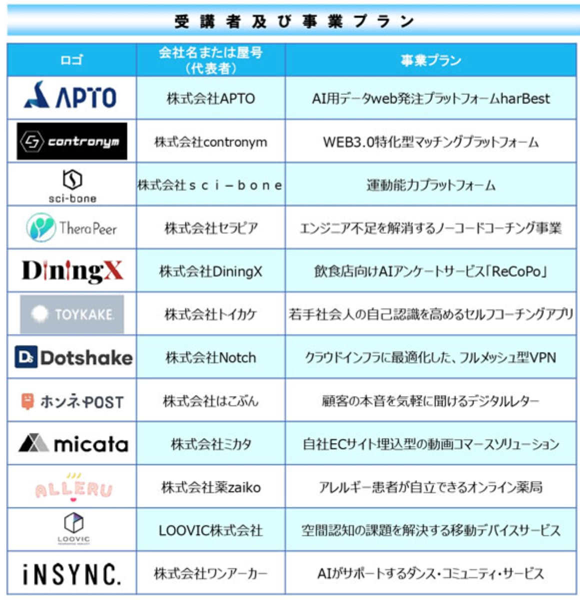 プログラムへの応募数は順調に増加しており、このたび12社が決定。これから約100名のメンター陣とともに、事業の成長を目指します。