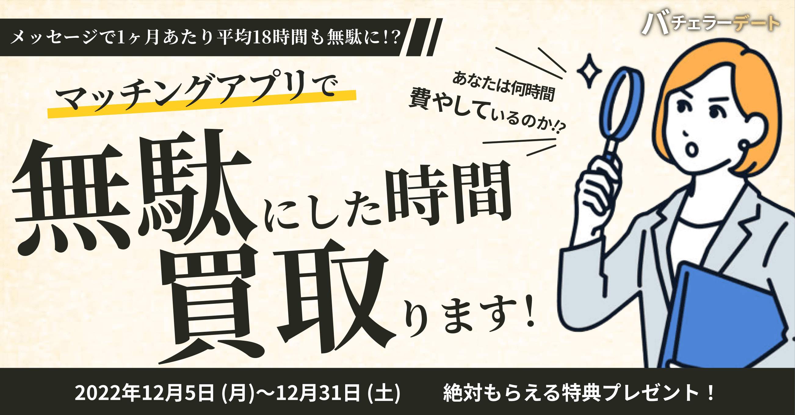 なお測定した『恋活ロストタイム』はバチェラーデートが買い取るキャンペーンも実施します。期間内に登録し、デートに行くと、5,000円相当のチケットやパーソナルカラーに合ったリップをプレゼントします。