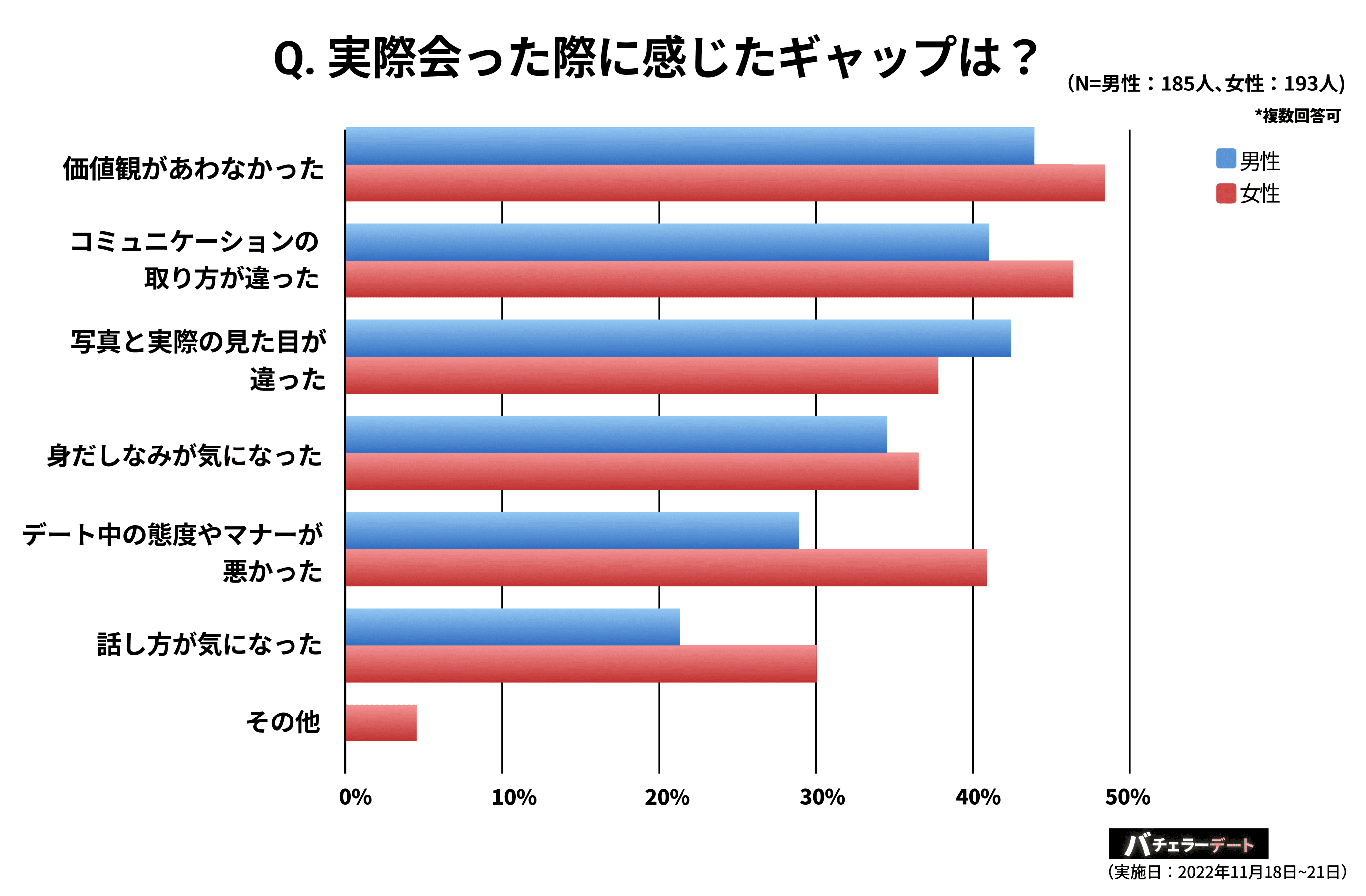 実際に会った際にメッセージとのギャップを感じた経験があると回答した方に、そのギャップは何か聞いたところ、第1位が『価値観が合わなかった』、2位が『メッセージと対面のコミュニケーションの取り方が違った』、3位が『写真と実際の見た目が違った』と続きました。具体的なエピソードとして『結婚に対する意識が感じられなかった』『イメージよりも話してみたら子供っぽかった』『メッセージではテンポが良かったが、実際に会うと喋らない人だった』などがあり、いずれもプロフィールやメッセージの情報だけで、期待する人物像が出来上がってしまい、期待値が上がってしまうことが原因と予測されます。