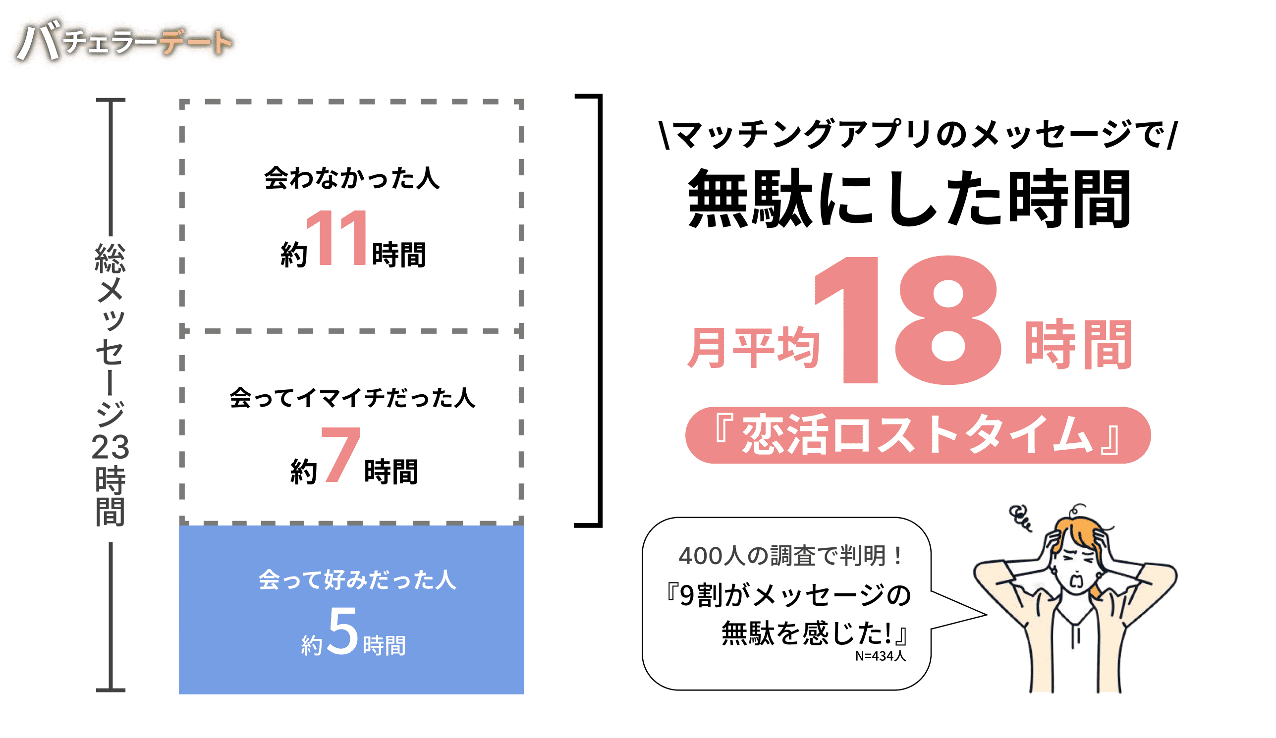 そこで、バチェラーデートはマッチングアプリで会わなかった人、会ったがイマイチだった人とのメッセージに費やして無駄にしてしまった時間を『恋活ロストタイム』と名付け、メッセージのやりとりが必要なマッチングアプリ(*2)を利用したことがあるバチェラーデートユーザーの男女400名に対し、今までに発生した恋活ロストタイムについて利用実態調査を実施しました。