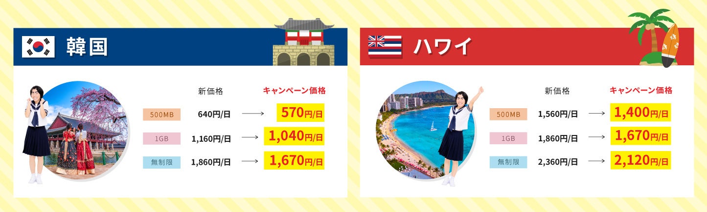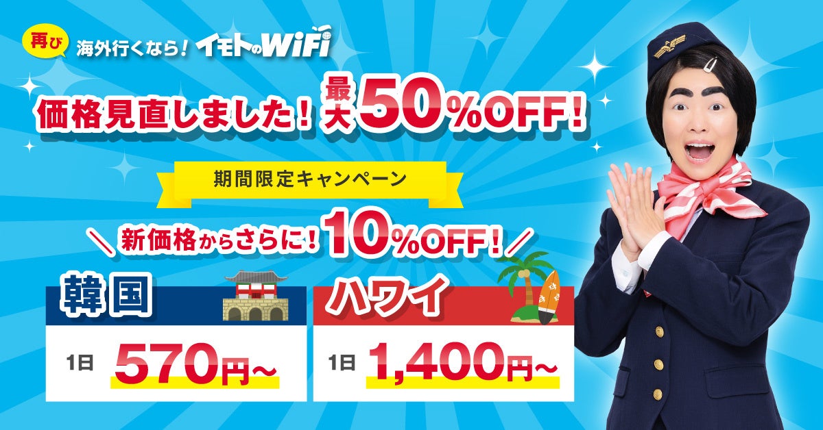 イモトのWiFiは、人気渡航国の韓国・ハワイを対象に新価格から更に10%オフキャンペーンを開始いたします。