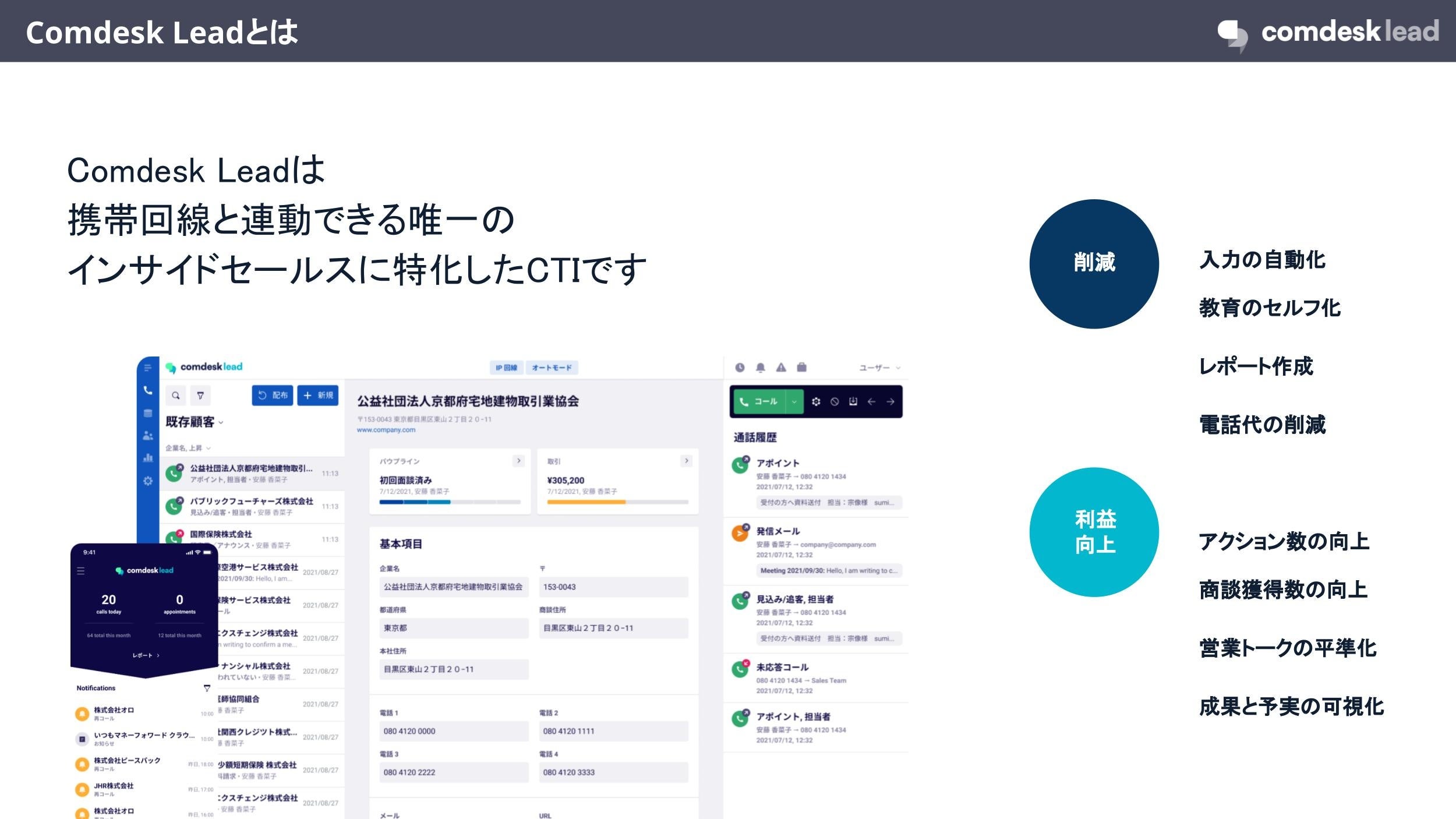 「Comdesk Lead」は、電話による営業活動を効率化し、収益性を最⼤化させるためのコミュニケーション・プラットフォームです。通常の営業活動やインサイドセールスの強化などを⽬的に、これまでに累計導入社数400社以上、導入IDも7,000以上の実績があります。