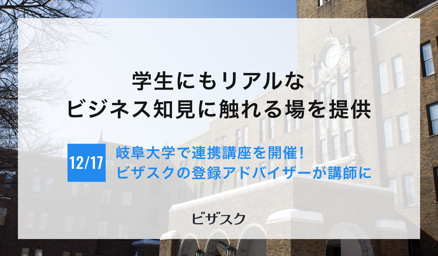 今回、その第一歩として岐阜大学との連携講座を開設いたします。当社は業務委託による伴走型支援サービスである「ビザスクpartner」として、岐阜大学に対し連携講座をご提供し、その講師として、アイコニックビート株式会社の代表取締役である河西様に登壇していただきます。当社及びアドバイザーが教育機関向けにワークショップ型の講演を行うことは、全国の大学で初の取り組みとなります。