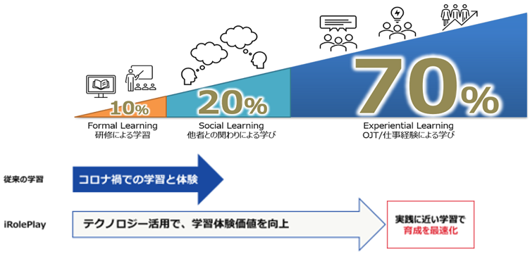 人材育成においては、学びは70%がOJT(仕事経験)、20%が他者との関わりによって得られるとされ、研修は10%に過ぎないと言われています。コロナ禍では実践によって得られる学びが大きく減少しており、ひいてはオンライン面談での対話力の影響も出ているのが課題となっています。