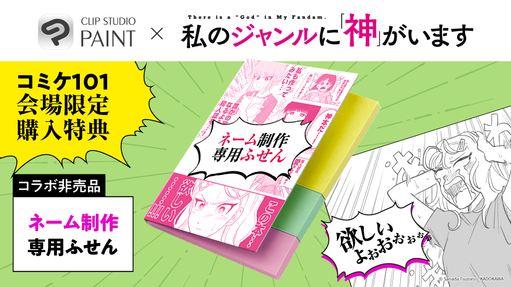 「C101限定クリエイター応援キャンペーン」では、同人活動に勤しむ人々の感情を描いた人気マンガ『私のジャンルに「神」がいます(「同人女の感情」)』真田つづる先生とのコラボレーションによるSNSプレゼント企画や購入者特典、セルシス製品が毎日、日替りで最大51%OFFになる「日替り割」を会場限定販売します。また、学生証のご提示で、コミケ販売価格からさらに20%OFFになる「学割」など、最新のデジタル制作環境をお求めやすい価格で入手できます。(*1/2)