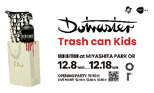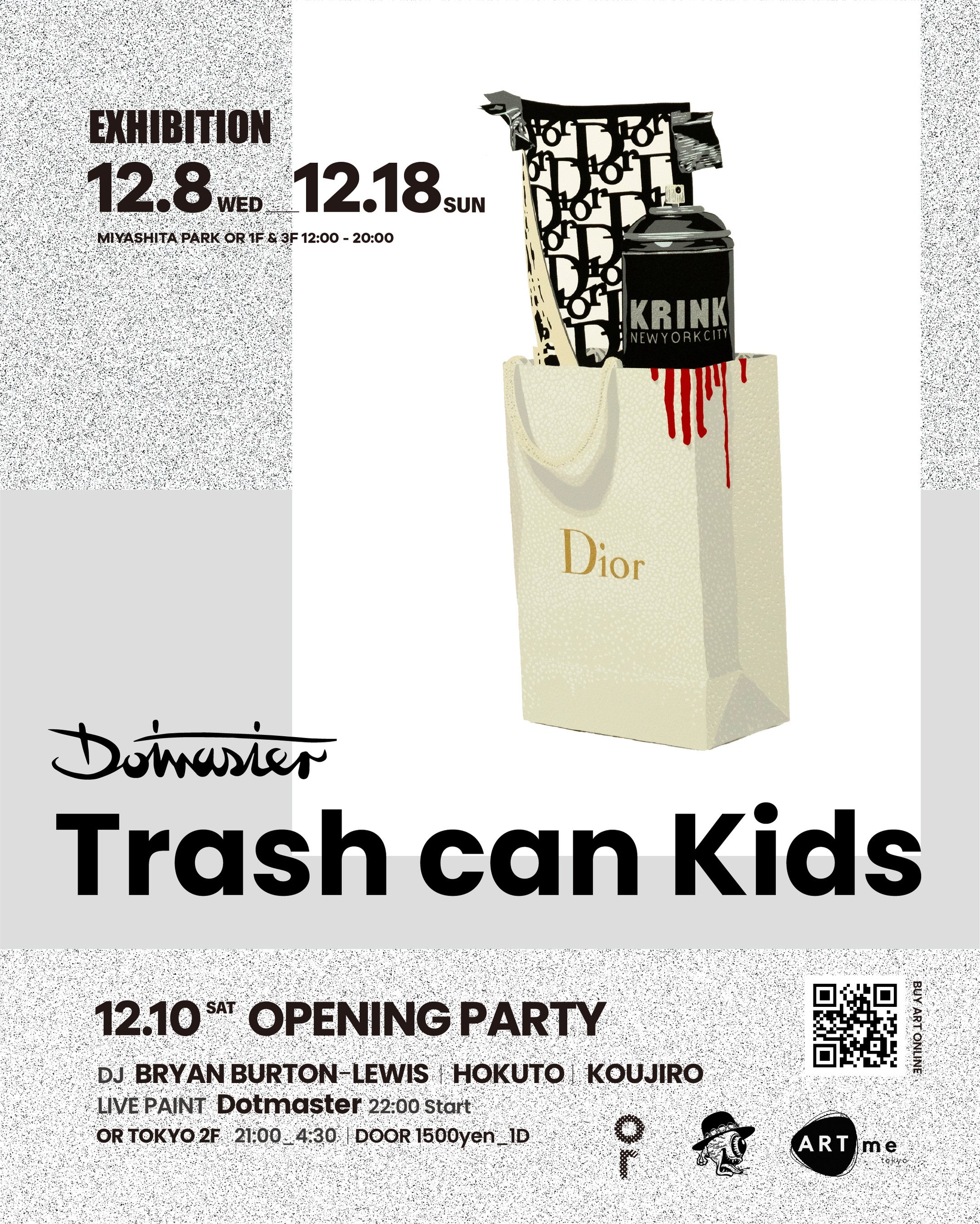 この度、AIDE株式会社が運営する、アート販売のオンラインプラットフォーム「ARTme (アートミー)」のローンチを記念して、「Dotmaster -Trash can Kids- (ドットマスター・トラッシュ・キャン・キッズ)」展を開催する運びとなりましたのでご案内いたします。会期中は、未発表作品の展示の他、DJイベントも開催。オープニング、レセプション、クロージングの各パーティーにはアーティスト本人が来場しライブペイントを披露、日本限定作品の販売もいたします。