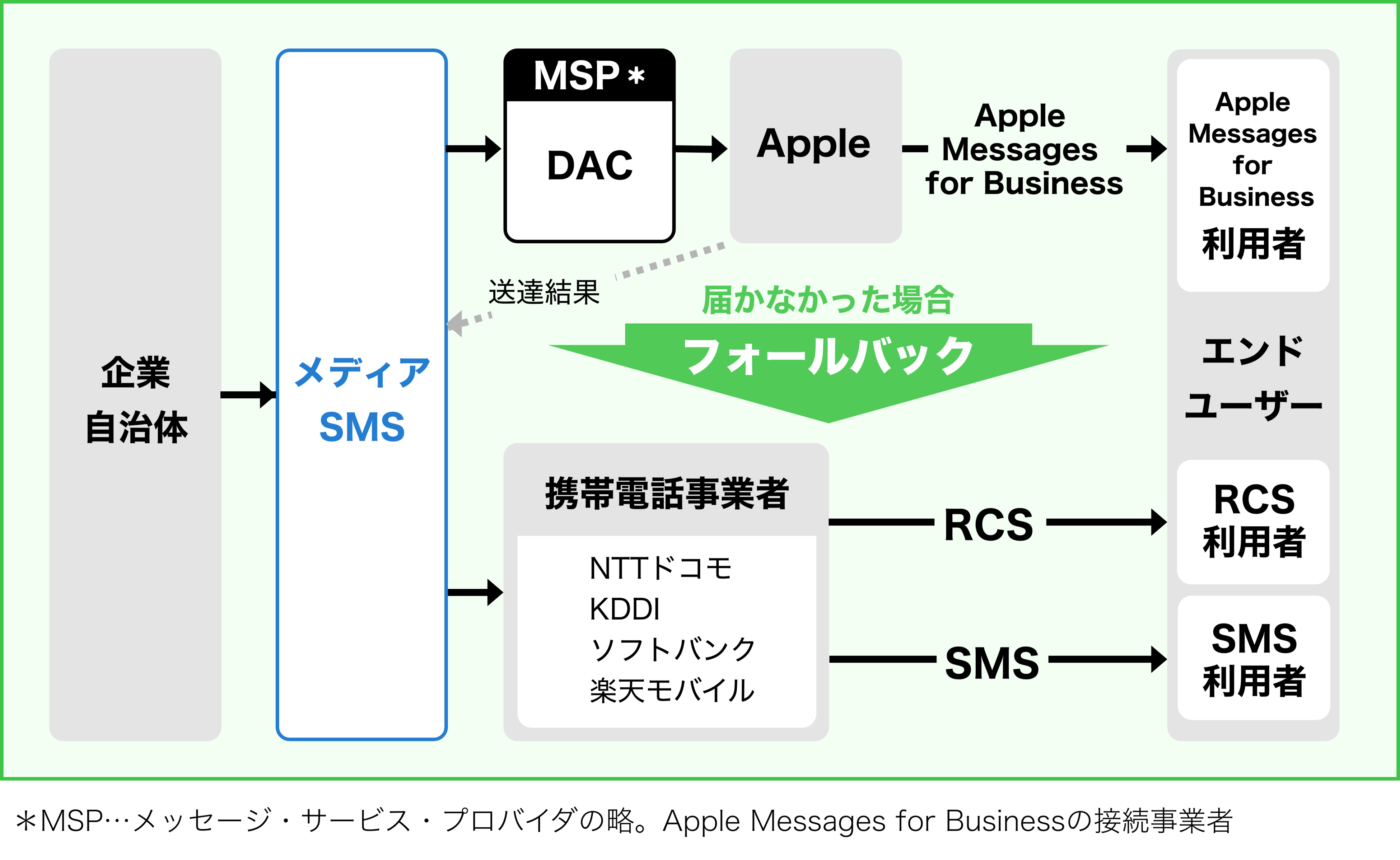 今回リリースしたメッセージングサービスは、SMSから「Apple Messages for Business」へ連携したり、「Apple Messages for Business」をRCS/SMS(※1)で補完するサービスです。企業がエンドユーザーにApple Messages for Businessでメッセージを送った際に、パーミッション(アクセス権の許諾)が取れていないなど、なんらかの理由でメッセージが届かなかった場合、シームレスにRCSやSMSにフォールバック(代替手段への切り替え)を行い、メッセージを届けることができます。