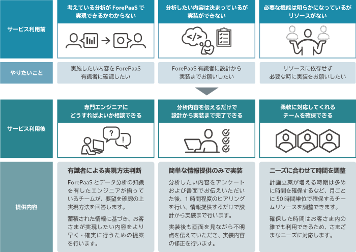 「データ分析ラボ for ForePaaS」を契約しているお客さまは、分析のイメージをエンジニアに相談、共有いただくだけで「ForePaaS」上に必要な機能を実装でき、実装された機能を活用するだけで分析ができるようになります。