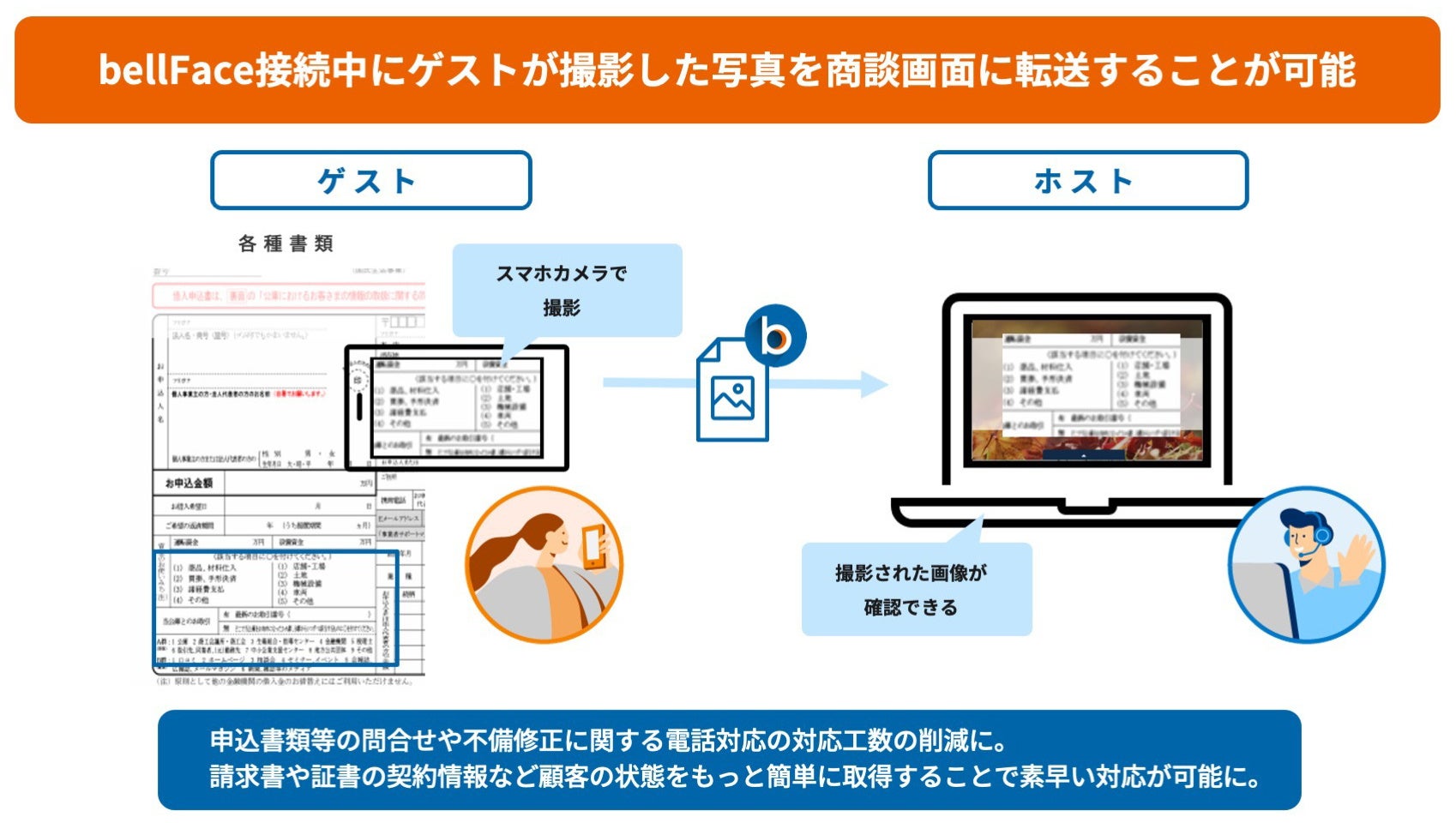 *1 スマートフォンのカメラ機能を用い、ゲスト側(ご相談者)で写真を撮影すると、bellFaceを繋いだままホスト側(弁護士)に写真を送信できる機能。