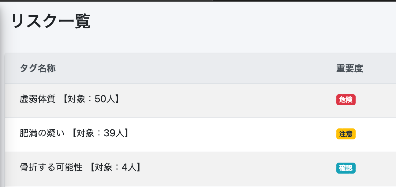 例えば、上記画像の「虚弱体質」というリスクは、入居者様に対して“定義のしづらい”ものです。『ADLearning』は入居者様に関する情報(文字列、数値など)を自動分析し、リスクのある入居者様に該当のリスクタグを付与します。
