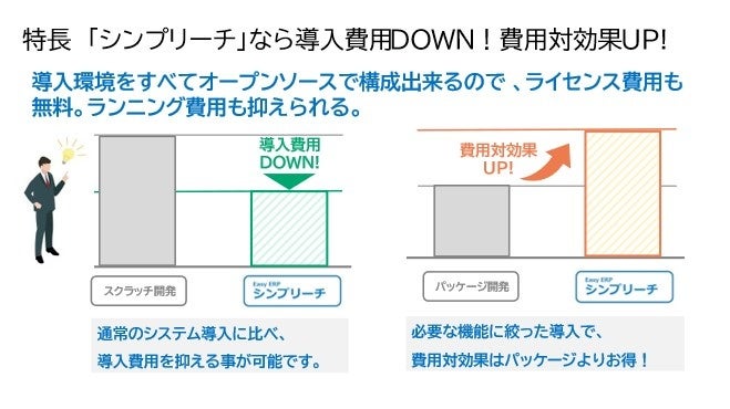 また、ERPに業務を合わせることが困難な場合、必要なデータをスプレッドシートで活用するようなことにもなりかねませんが、それでもERPのライセンス・保守コストは発生し続けます。オープンソースをベースとしたERP “シンプリーチ”は、データベースやミドルウェア等を含めて、ライセンス費用が必要なく、中堅企業のDX推進を高い投資対効果と圧倒的な低コストでご支援が可能です。