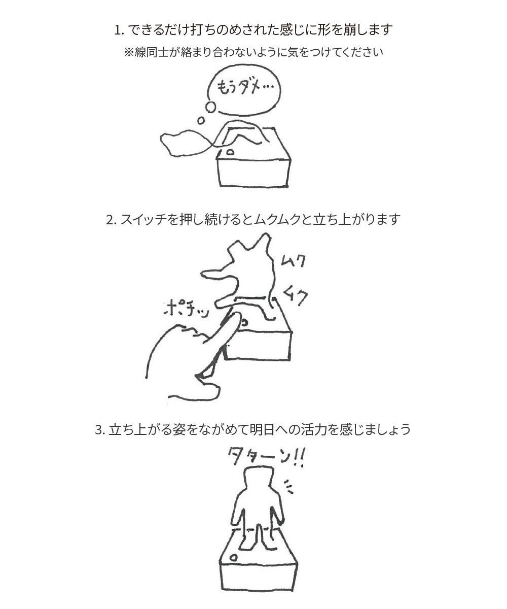 あそびかたは究極にシンプル。電池を入れて、「線人間」をグニャっとお好きな形に打ちのめしたら準備完了。スイッチを押し続けるとムクムクと立ち直ってきます。何度押しつぶされても立ち上がる健気な線人間の姿を眺めて明日への活力をほんの少しでも感じてもらえたら、そんな思いを込めています。