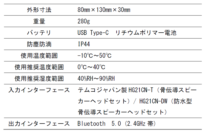 また、接続するヘッドセットは耐騒音に優れたテムコジャパンの骨伝導スピーカーヘッドセット「HG21シリーズ」に対応しています。過酷な利用環境に適した防塵・防滴性も備え、最長10時間の連続使用が可能です。
