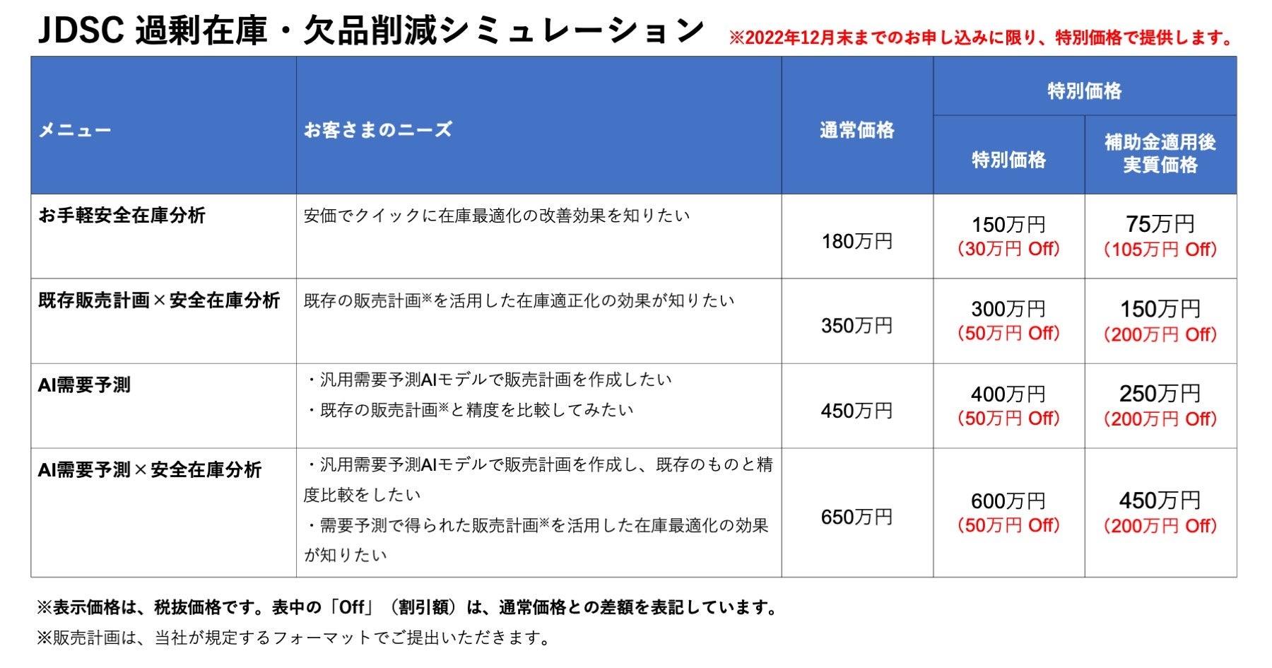 「JDSC 過剰在庫・欠品削減シミュレーション」は、AIを活用した在庫・欠品削減効果を低コストで検証できるサービスです。4つのメニューをラインアップし、お客さまのニーズに合わせて180万円(税抜)からお試しいただけます。本格的な発注支援ソリューションを導入する前に、導入効果を実感いただけるとともに、数千万円のコストと数ヶ月の時間が必要となるPoCの実施が不要になります。