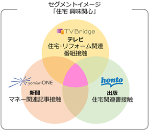 読売新聞グループの新聞読者をベースとした420万IDのデータ基盤「yomiuri ONE」※1と、SMNが活用可能なインターネット接続テレビ約900万台の視聴データ「Connected TV Data Bridge(「TVBridge」)」※2が既に連携しており、ここに今回、会員数760万人のDNPグループのハイブリッド型総合書店「honto」※3のアクセスデータを新たに連携させます。これにより、新聞・テレビ・出版物(雑誌等)の3種類のマスメディアを横断するデータマーケティングを実現します。