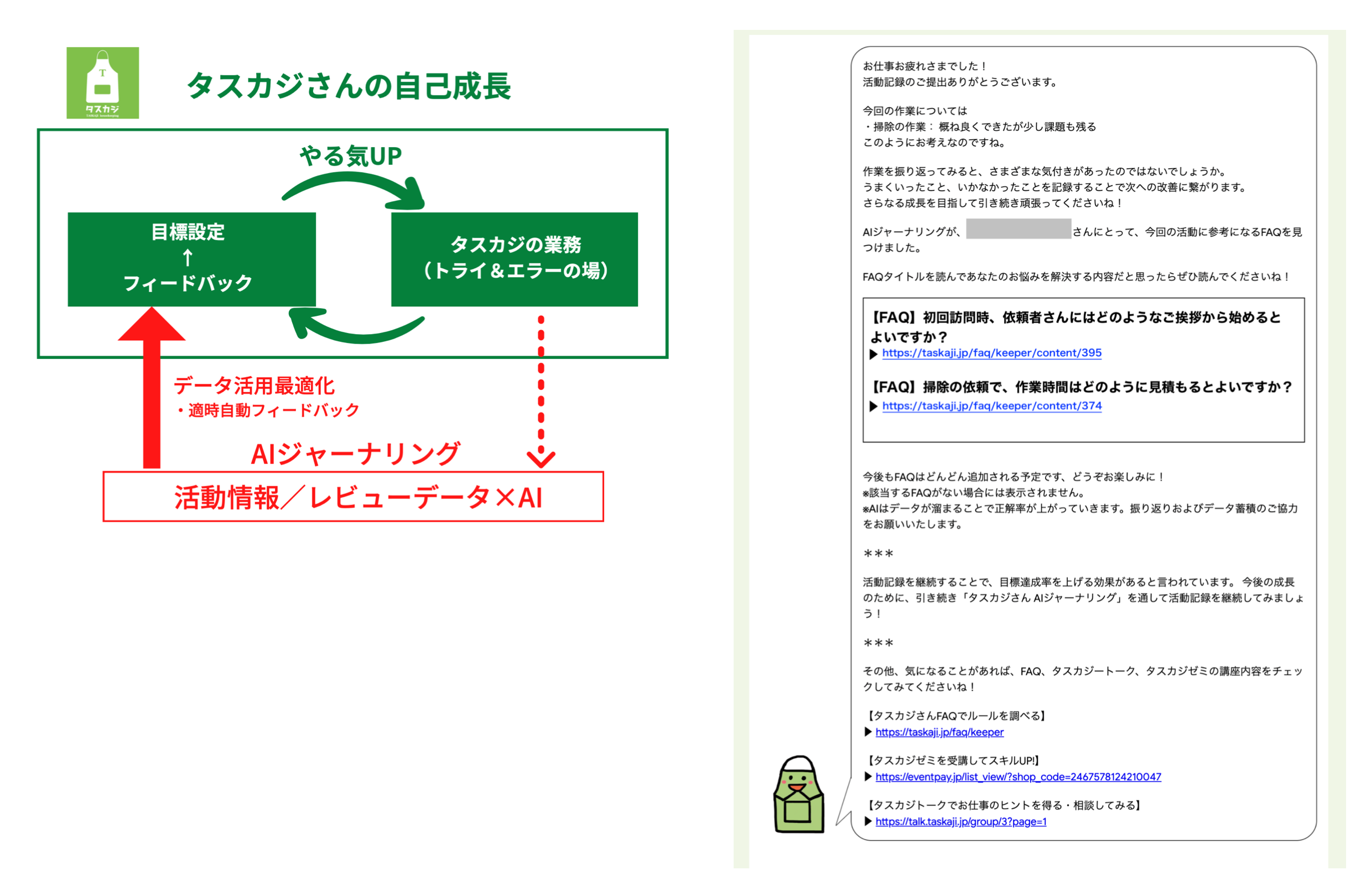 タスカジで活躍する働き手はフリーランスであり、スキルやマインドの成長を目指すには、自己管理でPDCAサイクルを回す必要があります。一般的に、フリーランスは、自身で立てた目標や計画の実行のあと、第三者から適切なフィードバックを得る機会が組織で働く人より少ないと言われています。すでにタスカジでは、“タスカジさん(タスカジに登録するハウスキーパー)”へ提供する学びの場「タスカジゼミ」や、同じタスカジさんとして働く仲間との情報交換や相談の場「タスカジトーク」など、ビジネススキルとマインドの両面の技術的な成長支援を行ってきました。このような既存の成長支援策に加え、プラットフォームからフィードバックすることで、自身の振り返りの機会を提供し、フリーランスとして活躍し続けられる環境づくりを目指してまいります。