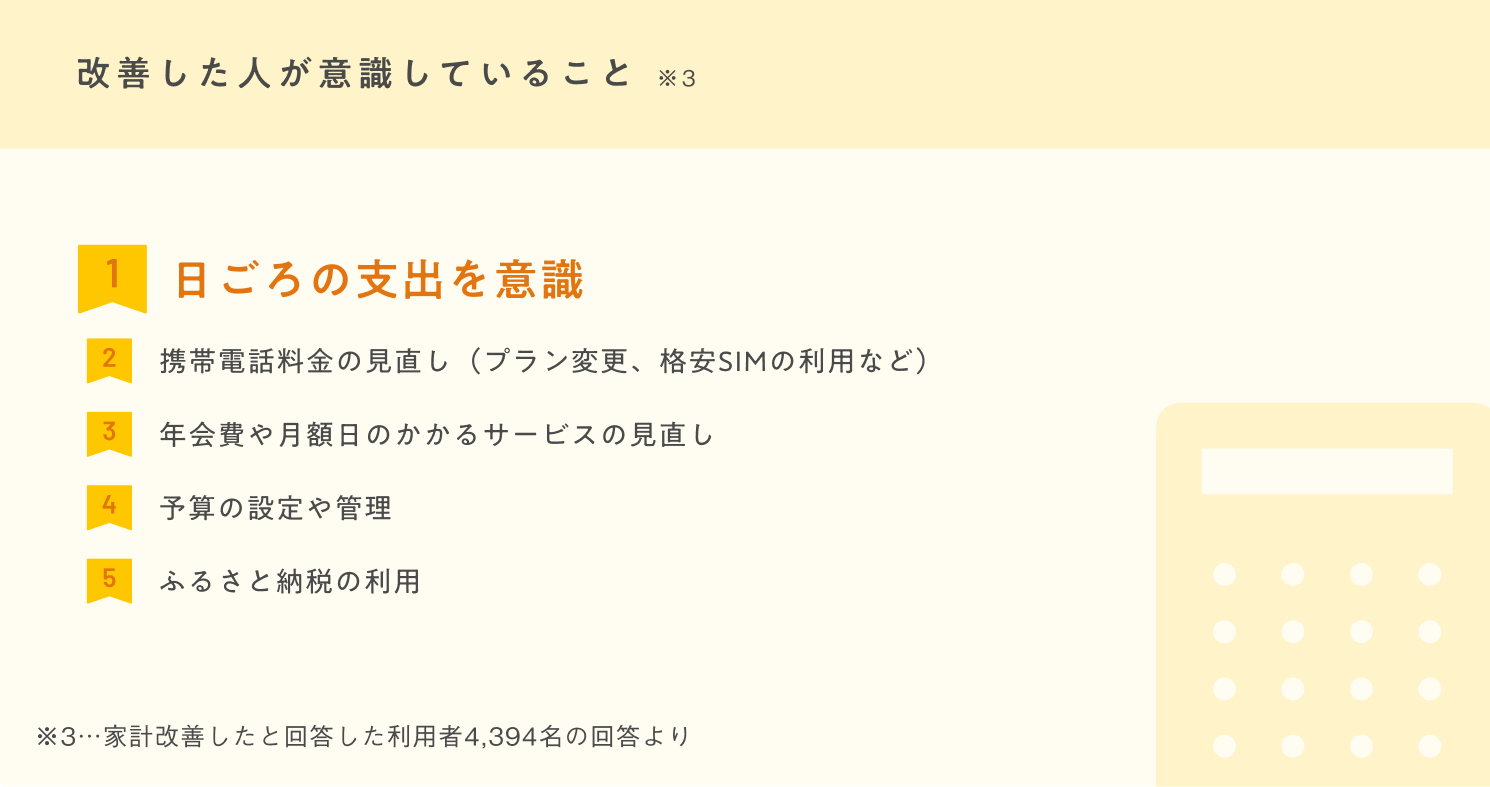 ・家計改善を実感した人が意識したことは、1位「日頃の支出」、2位「携帯電話料金の見直し」、3位「年会費や月額費のかかるサービスの見直し」。
