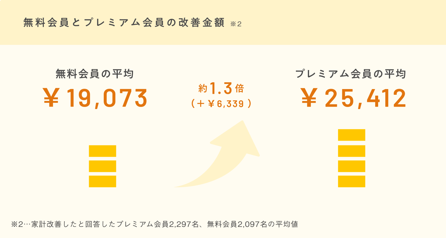 ・家計改善を実感した人の改善額は、平均で月23,426円。プレミアム会員は月25,412円で、無料会員の金額の約1.3倍。