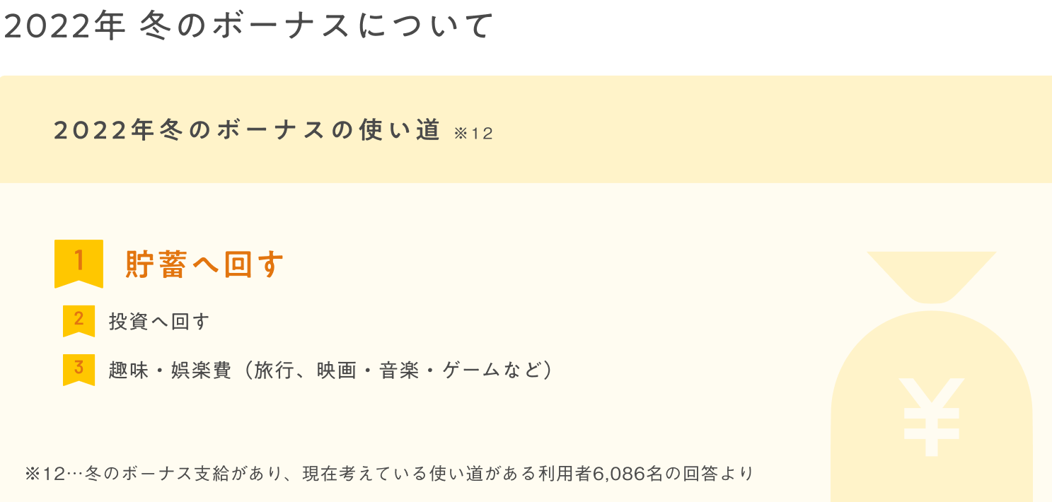 ・2022年、冬のボーナスの使い道として、1位「貯蓄へ回す」、2位「投資へ回す」、3位「趣味・娯楽費」。
