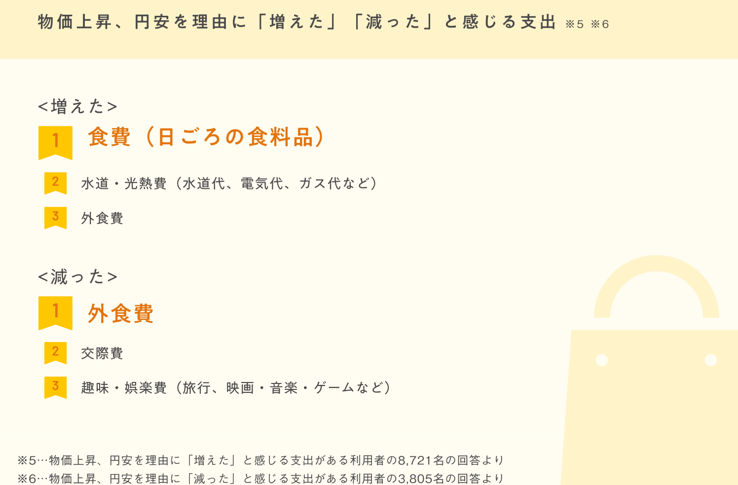 ・物価上昇、円安を理由に「減った」と感じる支出項目は1位「外食費」、2位「交際費」、3位「趣味・娯楽費(旅行、映画・音楽・ゲームなど)」。