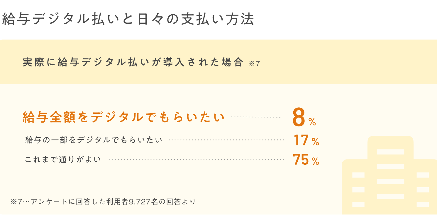・実際に給与デジタル払いが導入された場合、給与の全額をデジタルで貰いたいと回答したのは全体の8%。2021年の同調査(https://corp.moneyforward.com/news/release/service/20211216-mf-press/)では全体の10%が全額をデジタルで貰いたいと回答し、大きな変化は無かった。