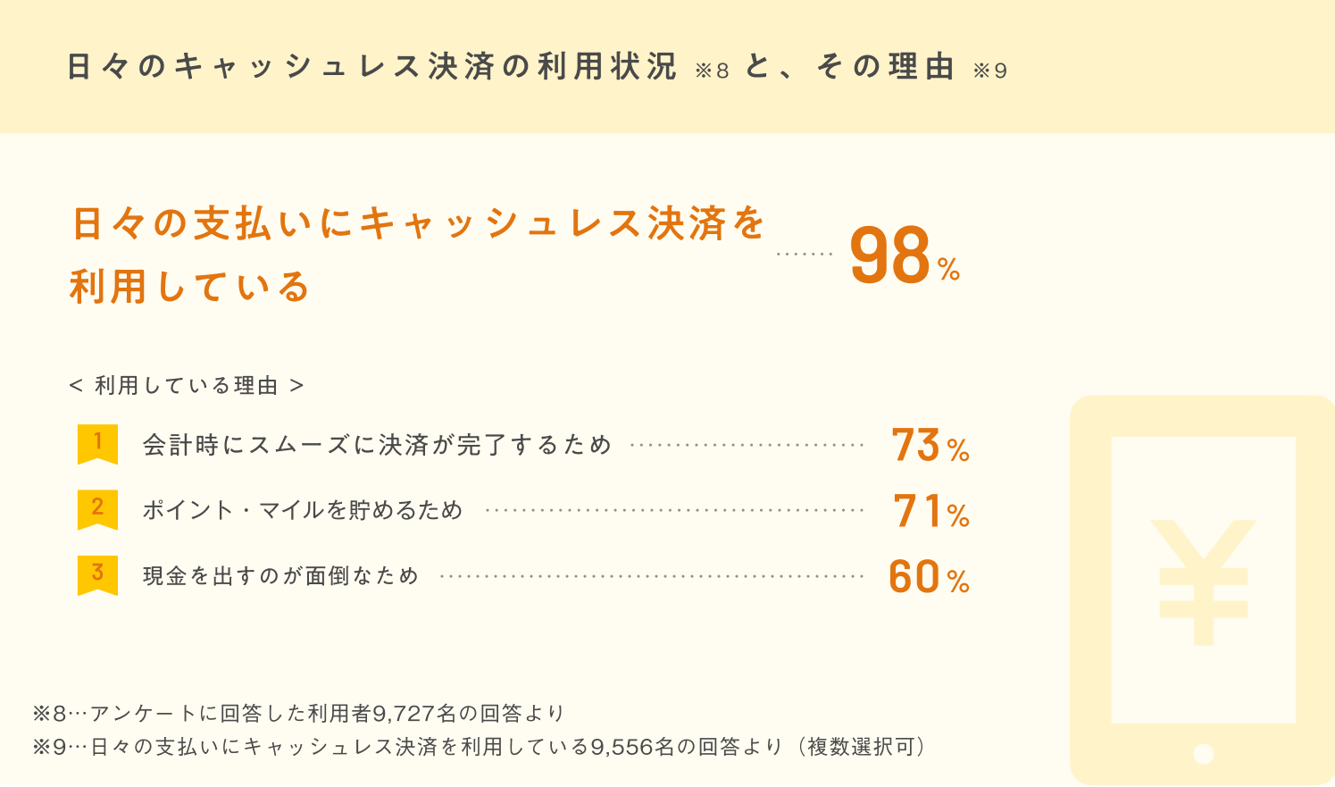 ・日々の支払いにキャッシュレス決済を利用しているのは全体の98%であり、その理由の上位は「会計時にスムーズに決済が完了するため」、「ポイント・マイルを貯めるため」、「現金を出すのが面倒なため」。